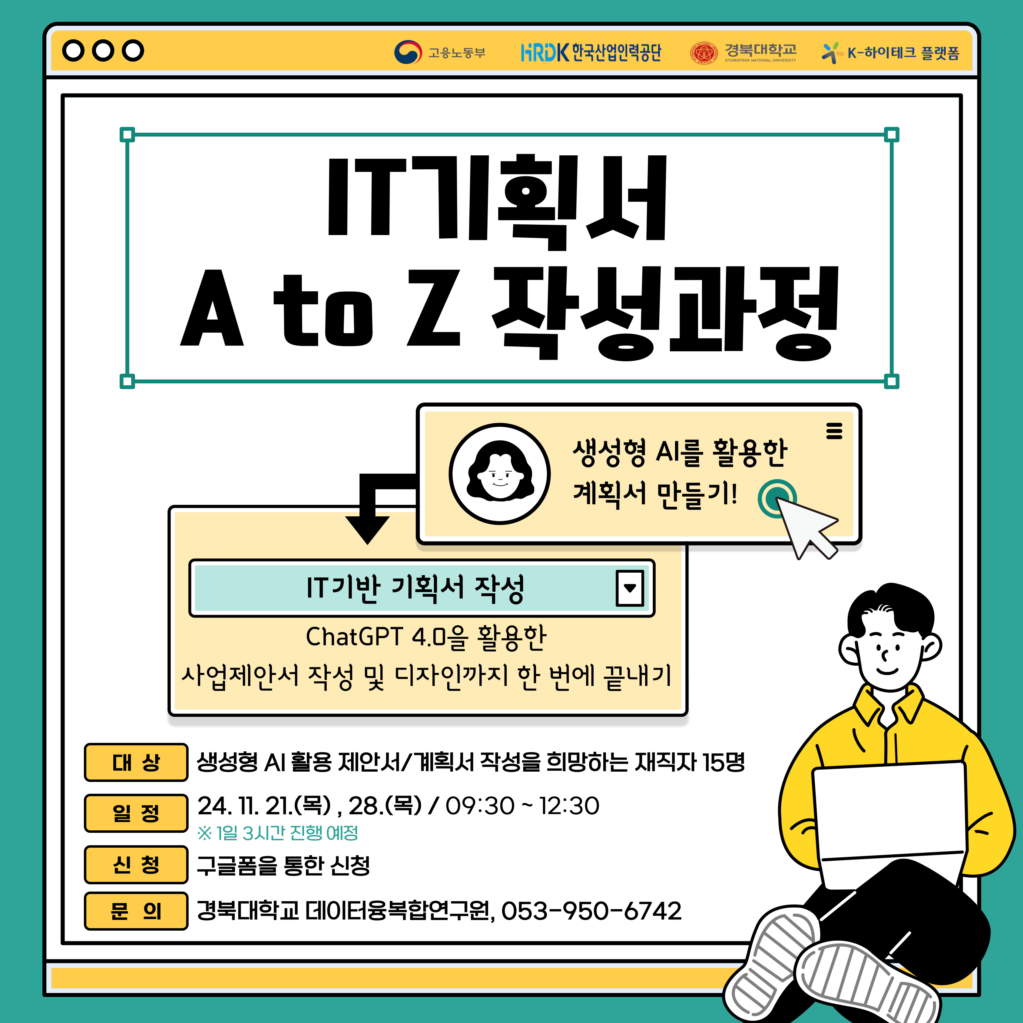 생성형 AI 활용 제안서 및 계획서 작성을 희망하는 재직자를 대상으로 ‘IT기획서 A to Z 작성과정 (2차)’ 교육을 실시하고자 합니다.
